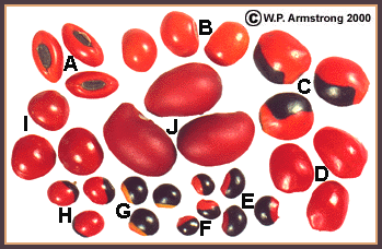 A. Erythrina caffra B. Erythrina sp. C. Ormosia monosperma D. Ormosia cruenta E. Rhynchosia sp. F. Rhynchosia precatoria G. Rhynchosia sp. H. Abrus precatorius I. Adenanthera pavonina J. Sophora secundiflora |